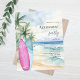 An invitation for a retirement party, for both men and women. A watercolored sandy beach, ocean waves and palm trees as background, and a blue and a pink surfboard on the beach.