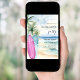 An invitation for a retirement party, for both men and women. A watercolored sandy beach, ocean waves and palm trees as background, and a blue and a pink surfboard on the beach.