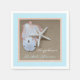 These great beach themed bridal shower paper cocktail napkins feature a starfish, sand dollar and seashell on a burlap look background. The photograph is surrounded by a small white edge and a larger peach edge and a still larger blue edge to make a beautiful beach theme. These are simply beautiful disposable wedding bridal shower napkins. Copyright henishousofpaper