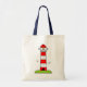 Beach theme tote bag with light house design. Nautical gift idea for beach bums and sailing enthusiasts. Colourful coastal illustration.