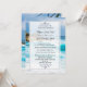 Beach theme wedding invitations with the ocean, blue skies, ocean, and a small rock island. Customise with your wedding details.