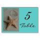 This great beach theme wedding table numbers card features a photograph of a starfish in the sand as the focal point with your table number customised to the right of the photograph. This is a great table number card for a beach themed wedding. Copyright henishouseofpaper