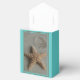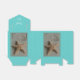 These beach themed wedding favour boxes feature a photograph of a starfish in the sand as a focal point with an imprint of a seashell. The photograph is surrounded with a beautiful aqua colour and a lovely white ribbon is used to close the favour box with the words "Thank You" appearing right below the ribbon. This is a beautiful favour box for a beach themed wedding reception. Copyright htenishouseofpaper
