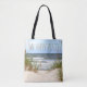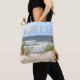 Tote bag with a beached themed photog showcasing waves, sand, blue sky, beach grass and the quote "My Happy Place."