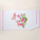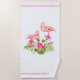 This beach towel is shown in a tropical flamingos and flowers print.