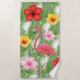 This beach towel is shown in pretty tropical flowers and flamingo design.
