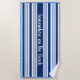 Bold in Blues, this beach towel shown with bold combination of stripes on white background in hues of cornflower blue, periwinkle blue and sapphire blue. Text in centre reads "somewhere on the Beach". Customise this item or buy as designed.