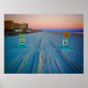 Photo art edit of beach traffic lanes, speed limit and caution signs, the traffic patterns in the sand, the ocean to the right and the resorts on the right starting with the Holiday Inn Resort. Barley visible in the distance is the main street pier with it's sky needle and restaurant over the ocean. Original photograph taken at dawn, I enhanced the original morning colours for this modern decorative resort art.