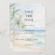 A watercolored sandy beach, ocean waves and palm trees as background. Personalize and add a date and your names.