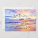 Having a beach wedding? This beautiful, watercolor, beach sunrise will be a marvellous Save The Date announcement. With it's tropical blue, yellow and pink colours in the sky and reflected in the ocean waves and a small island out in the distance. The back is violet purple with pink to magenta dots.