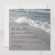 A beach wedding invitation featuring a background photo of ocean waves crashing to the shore. Personalise with details of your occasion in black text over sand at left.