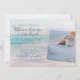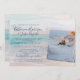 Turquoise blue, blush pink, peach and yellow sandy beach sunset or sunrise photo wedding invitation with elegant modern script typography and an overlayed geometric rectangle frame border. Upload your engagement photo or favourite beach picture on the front right side of the horizontal landscape orientated invitation.