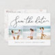 *Available for digital download* A modern coastal style save the date postcard designed to accommodate three square photos aligned side by side, with "save the date" across the top in chic handwritten script lettering. Personalize with your names, wedding date and wedding location beneath. Postcards reverse to show additional save the date details, including your wedding website, with your return address and space for recipient addressing. A transparent background pattern of seashells and coral adds beachy appeal.