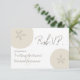 A beach wedding rsvp featuring sand dollar illustrations at top left and bottom right of front. Personalise the text on front and back.