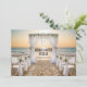 A beautifully decorated wedding arch stands on a sandy beach, framed by rows of chairs adorned with white tulle fabric and flowers.