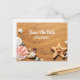 Wedding save the date post card with a photograph of a sandy beach with seashells. Personalise the custom text to suit your wedding announcement needs.
