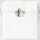 Includes 20 small stickers on one sheet. Adorable illustration of a bride and groom on the beach perfect for wedding decorations.