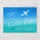 Blue and teal ombre watercolor beach wedding save the date card with a fun aeroplane heart monogram.