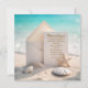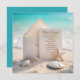 A blank card and envelope rest on a sandy beach surrounded by seashells, a starfish, and a turquoise ocean background for a wedding invite.