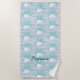 This personalised coastal beach towel features a pattern of aqua glitter, white starfish, and sand dollars on a rustic driftwood background, with script name.