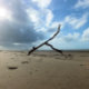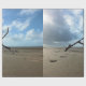 A photographic design of a beach, sky and a branch.