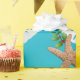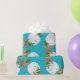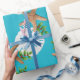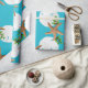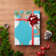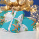 Quality Christmas wrapping paper on a roll with starfish and sand dollars "beach wreath" design. This large image is printed over an aqua blue background colour, with seashells and holly in brown, white and green making a circular wreath pattern. If you don't see a background colour you like, you may choose your own in the "customise further" area.