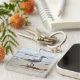 A beachy keychain with a Seagull on a sandy beach with the surf breaking in the background. On the back there are two Beachcombing Seagulls with one stooping and one flying over the shoreline. Fun in the sun for bird watchers and beach lovers.