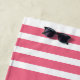 Personalised Coral Pink and White Stripe Beach Towel for Your Girls Weekend Friends Trip, Beach Vacation, or Cruise with editable text and wording for your date, destination or location, name, and fun quote like "beaches, booze, and besties" is the perfect keepsake for your travel squad or bridesmaids.