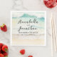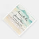 These elegant wedding napkins feature a beachscape image across the front. The bottom portion features a beautiful sandy beach, with turquoise water in the top portion. The waves are splashing across the sand beneath the sun. The wedding information is printed in the centre in a black font.