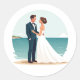 Includes 20 small stickers on one sheet. This charming illustration features a bride and groom standing on a sandy beach with a serene ocean backdrop, perfect for adding a romantic touch to any device or gift item.