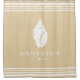 Elegant beachy white seashell and taupe shower curtain with white stripes and your personalised text.