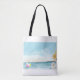 Tote bag featuring my watercolor painting of an ocean scene with beach ball and flowers.