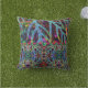 The colourful, original artwork by ZoeSPEAK on this 16” Throw Pillow was done in the style of an evening bag or clutch, with a bead trimmed flap. The image was made from Zoe’s original closeup photograph of a coral palm leaf, with other leaves in the background. The leaf colours have evolved into tropical blues, yellows and greens, with pinks, purples and reds in the dark background. The pink trim of the flap and the leaves have been embellished with green beads, giving the textured fabric design a hand sewn look.