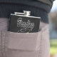The flask itself is fine. It’s a cheap flask, obviously bought in bulk, however am prepared to overlook that. Given that it is a personalized item, I would have liked to have seen gift boxing instead of the generic packaging. Terrible printing, and/or quality. It’s a cheap, tacky vinyl. It is not cut straight and is also applied in a way that it is overhanging the bottom, causing the glue to catch on items and it will eventually roll and tear, damaging the wrap.