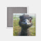 Full colour photographic image of an EMU, or large ostrich-like bird, with details showing feathers and plumage, and its beady brown eyes intently focused on its prey - the photographer!