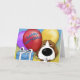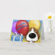 Adorable Big Nose Beagle with a birthday present and holding balloons in his mouth. Balloon reads Rappy Rirthday!