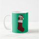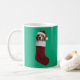 A Beagle is wearing a Santa hat and is sticking out of a Christmas stocking.