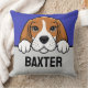 A personalised Beagle throw pillow for dog lovers, with a cute Beagle peeking over a ledge and a custom text box where you can type in your dog's name or any other text. A fun customisable gift for any Beagle dog mum, dad, trainer or dog lover.