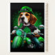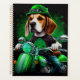 A furry friend behind the handlebars of a shiny green bike, wearing a green Saint Patrick's Day outfit that makes heads turn. The dog is dressed in a festive ensemble, complete with a green bow tie and a matching top hat that sits snugly atop their head. The outfit features intricate designs of shamrocks and leprechauns, making it clear that this dog is ready to celebrate Saint Patrick's Day in style.