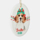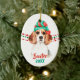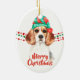 A cute Beagle dog wears a red and green Santa Claus hat in front of strings of red and green Christmas beads on both sides of this ornament. At the bottom are two text fields in matching red and green for your own text. The back has the same image with a third text field in red. Perfect for anyone who is owned by a beagle!