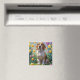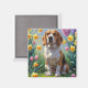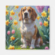 A cheerful dog sits peacefully on lush green grass, surrounded by colourful spring blooms under a soft blue sky. This digital oil painting captures a serene moment with expressive brushstrokes, warm colours, and a sense of gentle joy.