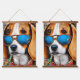 The ultimate in funky retro style, this pupper is sure to make a statement with their bold, colourful style! This playful pup is rocking a pair of oversized sunglasses with a bright pink frame, blue lenses, and purple and orange accents.