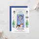 Announce your new address with our stylish announcement featuring a Beagle, blue front door, welcome mat, slate sign, topiaries and a floral wreath set on a grey brick background.