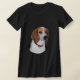 Beagle wearing red dog collar poses for a portrait. If you have a Beagle or your parent's dog is a Beagle, this Friskybizpet Design t-shirt a a fun gift idea for just about any occasion.