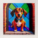 A cheerful beagle sits on a stone doorstep, framed by a vivid stained glass window. Bold colors and geometric shapes create a playful, artistic scene ideal for pet, art, or home decor themes.