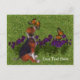 Cute beagle puppy with butterflies, purple flowers, and blue skies painting customisable postcard.  Replace your text in the template, or be sure to delete for plain card.  Click on Customise to change font size, style, and colour, and to add text.  Great for save the date and new address announcements.  If you need help or have any requests, please contact me.  This image is available on many products in my gallery.