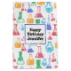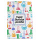 Gift bag with a fun and colourful pattern. Research scientist vibe with beakers and flasks of different shapes and sizes in bright happy colours.