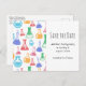 Save the date postcard with a fun and colourful pattern. Research scientist vibe with beakers and flasks of different shapes and sizes in bright happy colours.