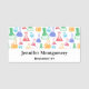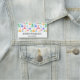 Name tag with a fun and colourful pattern. Research scientist vibe with beakers and flasks of different shapes and sizes in bright happy colours.