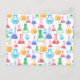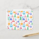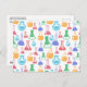 A postcard with a fun and colourful pattern. Research scientist vibe with beakers and flasks of different shapes and sizes in bright happy colours.